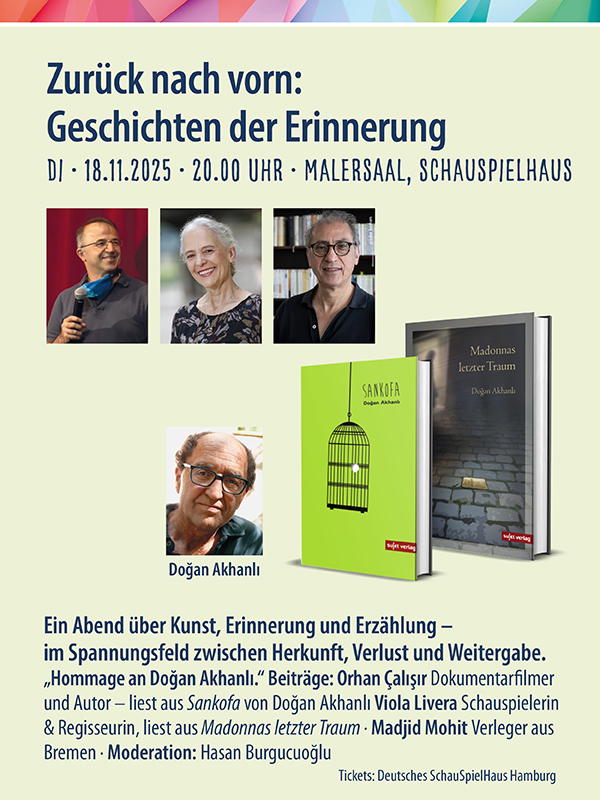 18. November 2025 – Doğan Akhanlı: Worte gegen das Vergessen Literatur als Widerstand: Eine Hommage im Malersaal des Deutschen Schauspielhauses Zum Abschluss der Literatur- und Theatertage „Grenzenlose Geschichten“ widmen wir den Abend dem verstorbenen Schriftsteller, Menschenrechtler und politischen Denker Doğan Akhanlı. In einer bewegenden Lesung aus seinen...
